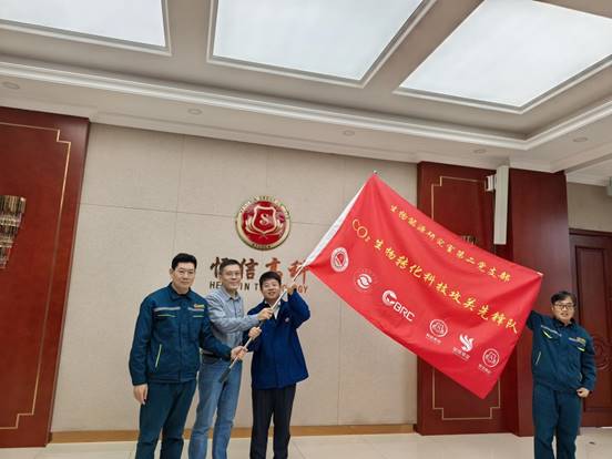 活动最后,恒信高科向青岛能源所生物能源研究室第二党支部授予“CO₂生物转化科技攻关先锋队”旗帜。