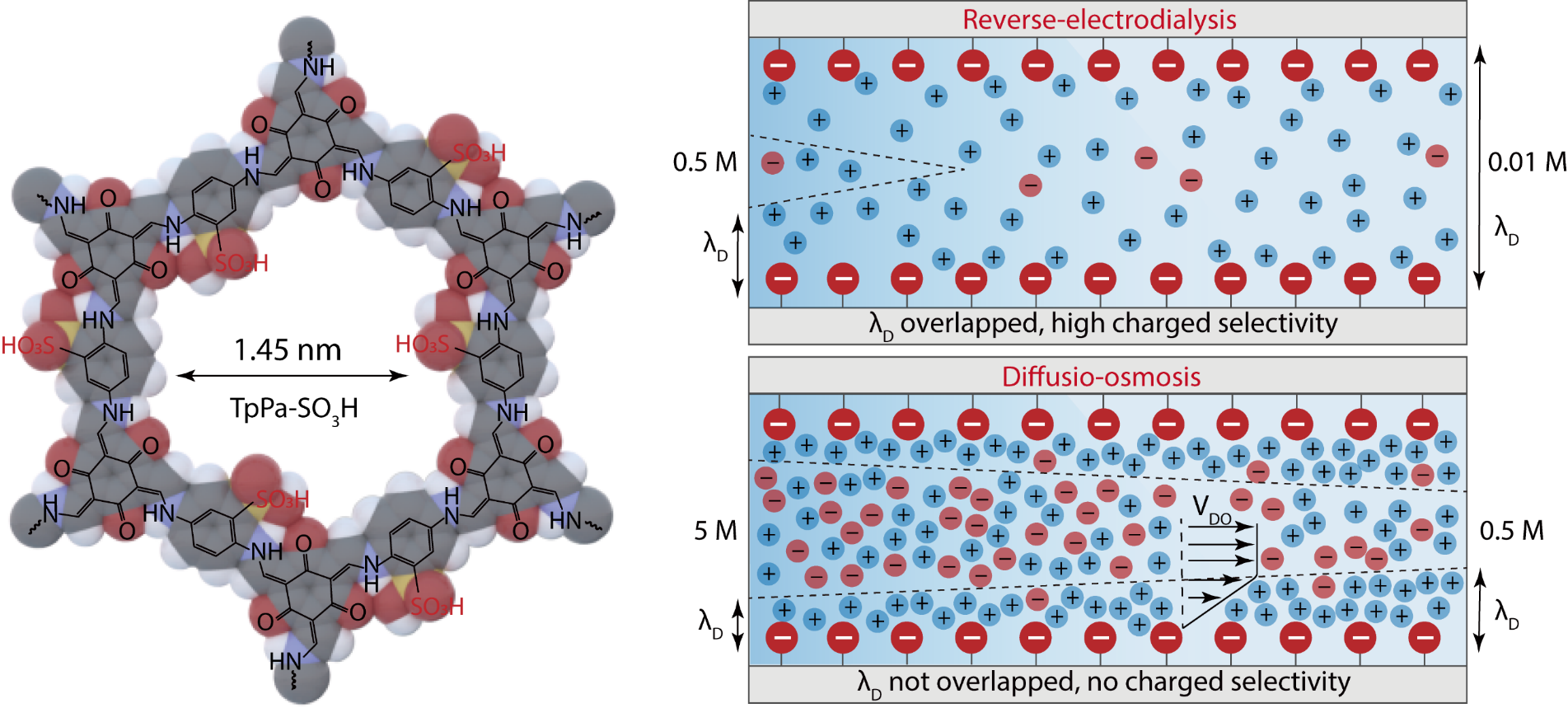 此前,利用单孔氮化硼纳米管、石墨纳米通道的研究已表明该机制有望实现超高功率密度的盐差能转换,但在膜尺度上仍缺乏相关研究。研究团队针对难以找到合适的膜材料匹配该机制开展研究,发现利用磺酸共价有机框架(COF)膜致密分布的磺酸基团、垂直排列的孔道结构,可以实现基于扩散-渗透机制的可规模化盐差发电。