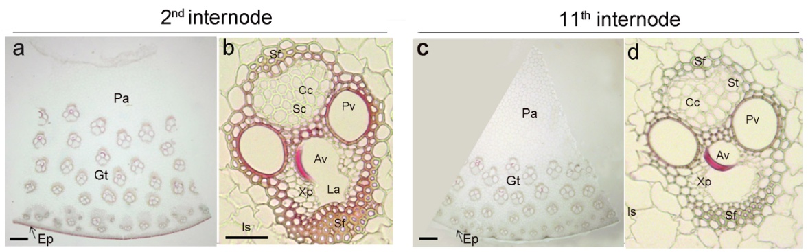 周功克等在研究中发现,结晶化纤维素与木糖是南荻茎细胞中分布最广的多糖,两者在除韧皮部之外的区域均有大量分布,且在不同发育时期的茎中具有相似的分布特点。韧皮部主要存在的多糖是木葡聚糖。而果胶质多糖则在南荻的茎细胞中,尤其是维管束区域,其分布呈现多样性。该研究同时鉴定到长链阿拉伯聚糖,半乳糖醛酸,岩藻化木葡聚糖等在不同发育时期的茎中分布形式具有很大差异。