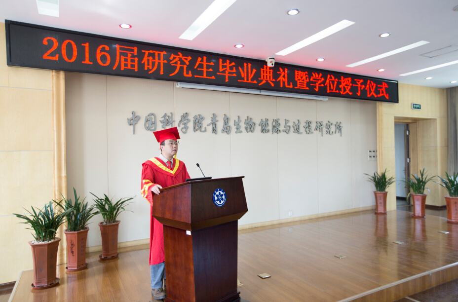 毕业典礼上,吕雪峰宣读了2016届毕业生名单并对大家顺利毕业取得学位表示祝贺。研究生导师们分别为各自的毕业学生颁发毕业证书,彭辉、吕雪峰为获得博士、硕士学位的毕业研究生扶正流苏。随后,两位所领导为优秀学生和国家奖学金获得者颁发荣誉证书。2016届硕士毕业生王在伟、先进可持续材料中心主任阳仁强研究员分别代表毕业生和研究生导师发言。
