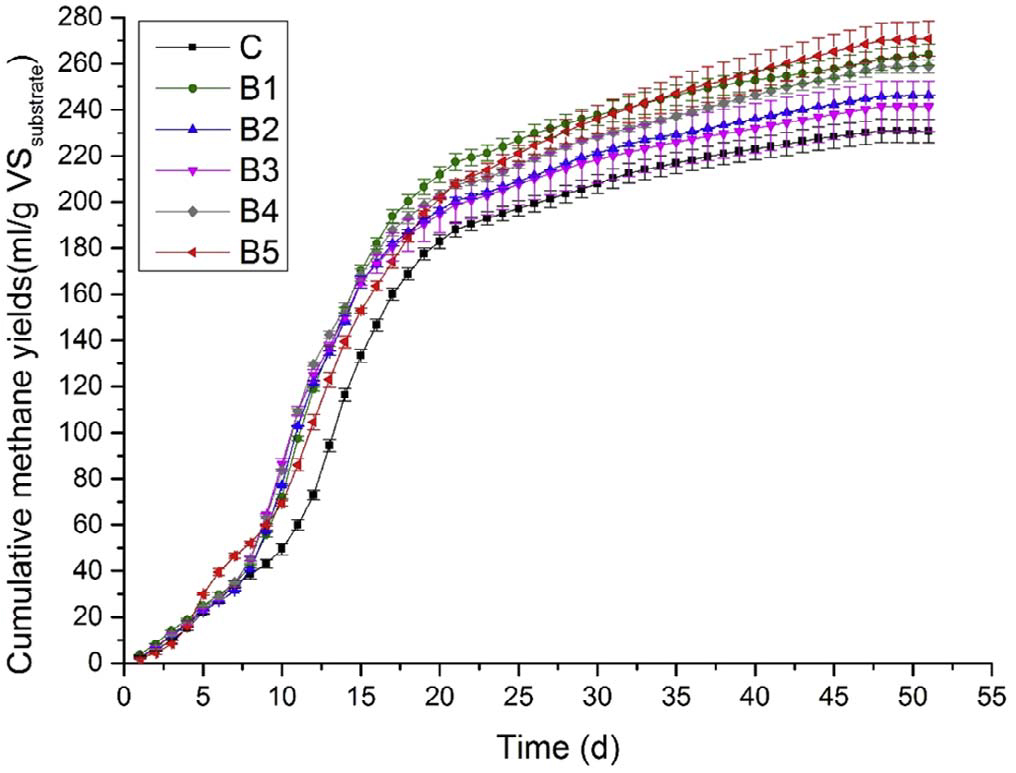 图1 微生物-微氧预处理玉米秸秆累积产甲烷量(B5)