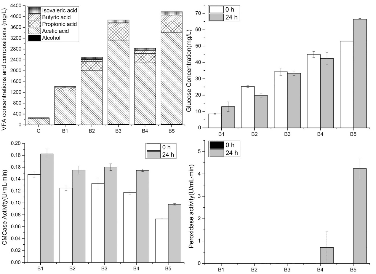 该研究组在近期研究中发现,利用厚壁菌门中枯草芽孢杆菌(Bacillus subtilis)作为微氧预处理接种物,取代沼液菌群,可提高玉米秸秆厌氧发酵17.35%的产甲烷量,并将预处理温度降低至37℃。该工作于2018年7月发表于Bioresource Technology(2018,259,18-23)。与沼液菌群相比,利用Bacillus subtilis纯菌液预处理后,产生过氧化物酶,酶活达4.24 U/mLmin;且在24h预处理后,木质素水解率23.0%,半纤维素水解率18.1%,纤维素损失较少。本研究为微生物-微氧预处理强化厌氧发酵技术的产业化应用提供理论支持,并为进一步调控代谢途径以提高纤维素生物质水解率和甲烷产生量提供基础支持。
