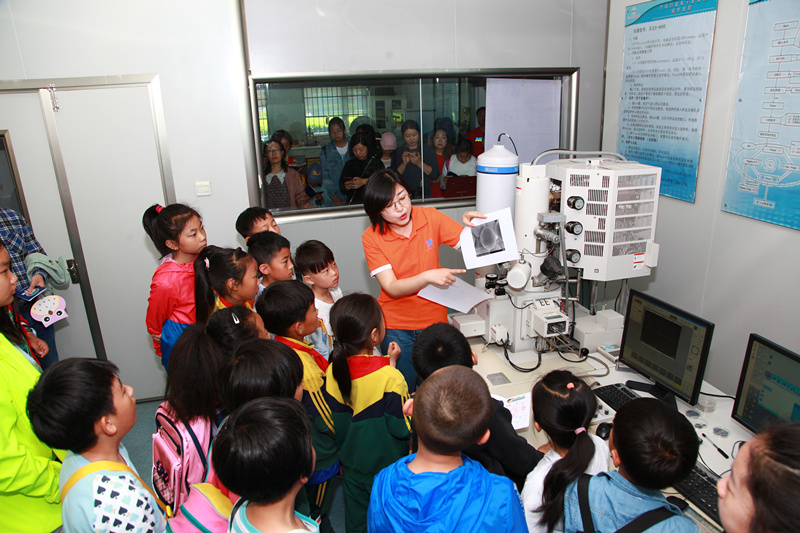 在大型仪器平台,志愿者以实验演示结合现场讲解的形式,向公众展示了气相色谱与质谱联用仪、液相色谱与质谱联用仪、核磁共振波谱仪、X射线衍射、透射电镜、原子力显微镜等九台大型实验仪器。使公众从原子分子结构认识物质世界、从微观形貌认识世界。例如参与活动的小朋友在扫描电镜下观察到了头发毛鳞片结构以及纳米颗粒,通过红外光谱探索分子结构的奥秘,探测衣服面料的成分。
