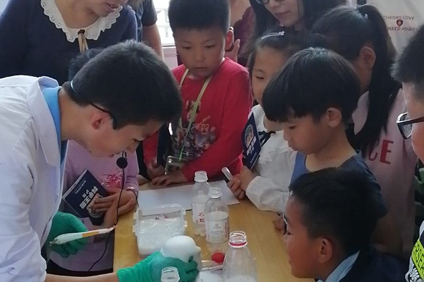 在“科学大家谈”环节,环境资源化与水回用研究组研究员张杨、微生物代谢工程研究组副研究员王玮华分别以《你身边的“膜”法故事》、《小小微藻,跨越海洋飞向太空》为题做了两场科普报告。张杨用图文并茂的形式介绍了什么是“膜”及“膜”的用途—“膜”法洁净水与空气、“膜”法穿戴、“膜”法治病、“膜”法发电,让公众了解了“膜”的神奇故事。王玮华从微藻的起源、种类、优点展开,以通俗易懂的语言阐述了微藻如何实现从海洋“飞向”太空。“科学大家谈”受到了社会公众的热烈欢迎,并就感兴趣的问题与科研人员进行了探讨和交流,积极互动,现场气氛活跃。“少年爱科学”环节是本次活动的一大特色。为体现科普工作对青少年创新能力培养的影响,研究所首次邀请了科研人员子女代表—市北二实验初中学生崔浩然以及共建创新实践基地合作单位—青岛二中高一学生王源海来所现场做科学展示。崔浩然及同伴带来了“奇妙的化学蠕虫”、“有趣的泡沫”、 “利用化学反应吹气球”科学小实验,王源海及同伴向公众展示了自行研制的全新抽水装置,该环节引发了公众的极大兴趣,现场热闹非凡。